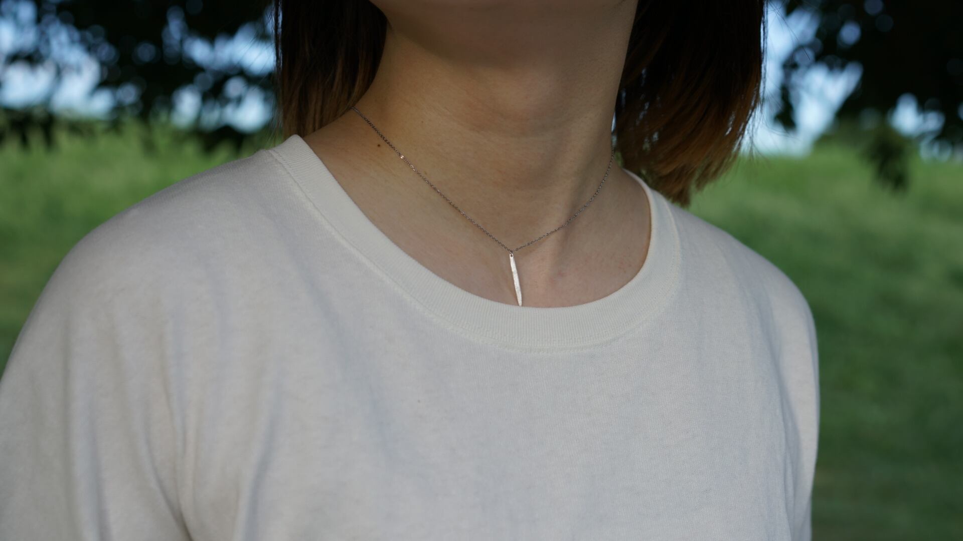 雀の涙【すずめのなみだ】 すずめの流す涙ほどのもの。ごくわずかなもののたとえ。 小指の先に"ちょん"と乗るくらいの小さなサイズのペンダントトップ。 完全な丸ではなく涙のしずくのようにぽてっとしたフォルムです。 小さくてもごくわずかでも、ちゃんとそこにある。 【素材】 アートクレイシルバー。 アートクレイシルバーとは、細かい純銀の粉末と水分、結合材を練り合わせた粘土のことです。 自由に形を作り乾燥させて削って整え、高温で焼くことによって水分と結合材が燃えてなくなり純度99.9%以上の純銀だけが残ります。 そんな素材を使って制作しております。 ※表示価格はチェーンも含めたお値段です。 【サイズ】 粒の大きさ→0.6cm チェーンの長さ→約42cm